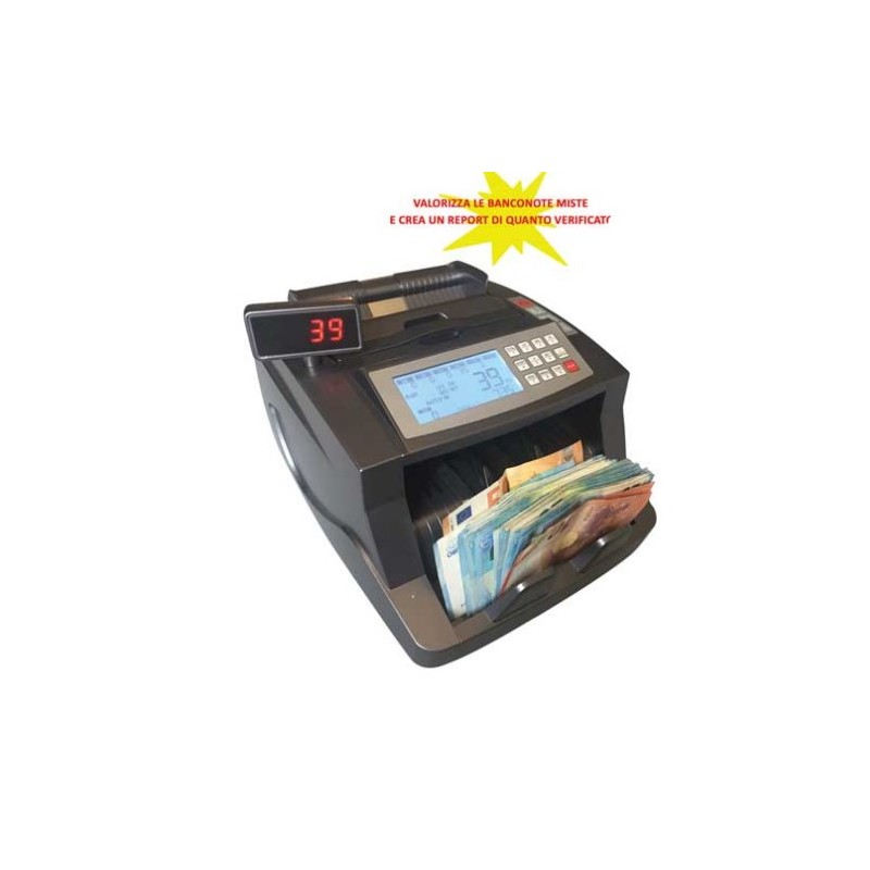 E' in grado di: contare, controllare, verifiicare e valorizzare una grande quantità di banconote miste inserite in contemporanea nell'apposito cassetto. Sul display luminoso sarà pertanto possibile visionare un REPORT di quante banconote sono state contate e verificate, l'importo in EURO di ogni taglio e l'importo totale in EURO delle stesse.