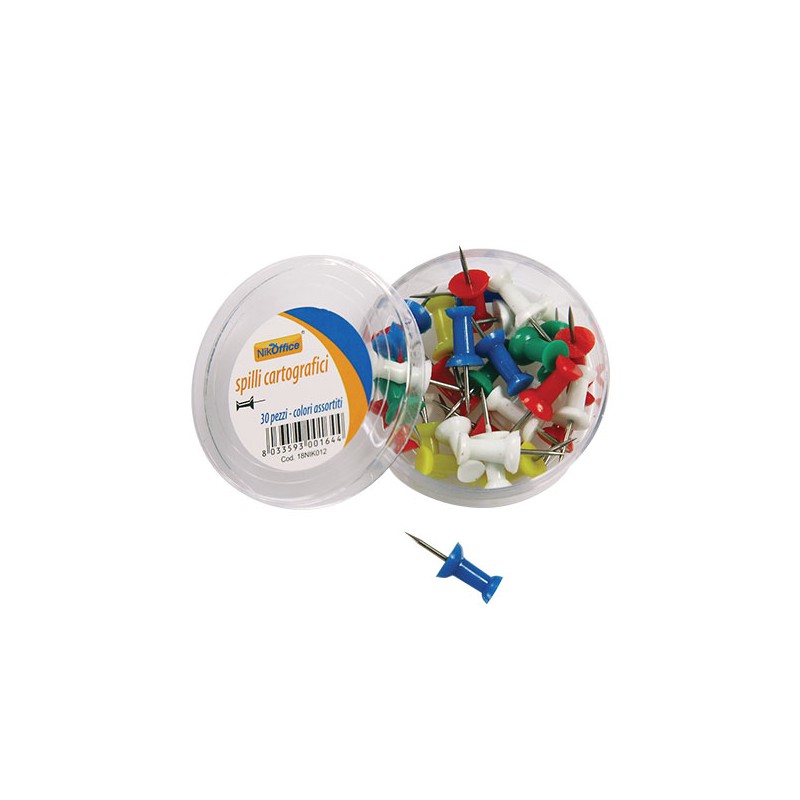 Spilli in acciaio per uso cartografico, testina colorata in plastica, 30 pz. per scatola.